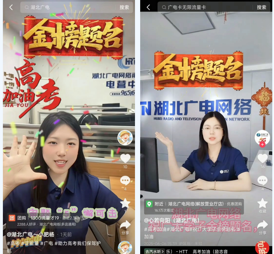 更添亮点的是,在本次宣传服务活动期间,一些“志愿服务点”及营业厅的工作人员采用抖音直播形式,将美好祝福传递给万千高考学子,不仅有效缓解了考生和陪考家长们的紧张焦虑情绪,还进一步提升了广电品牌影响力,收获社会各界广泛好评。