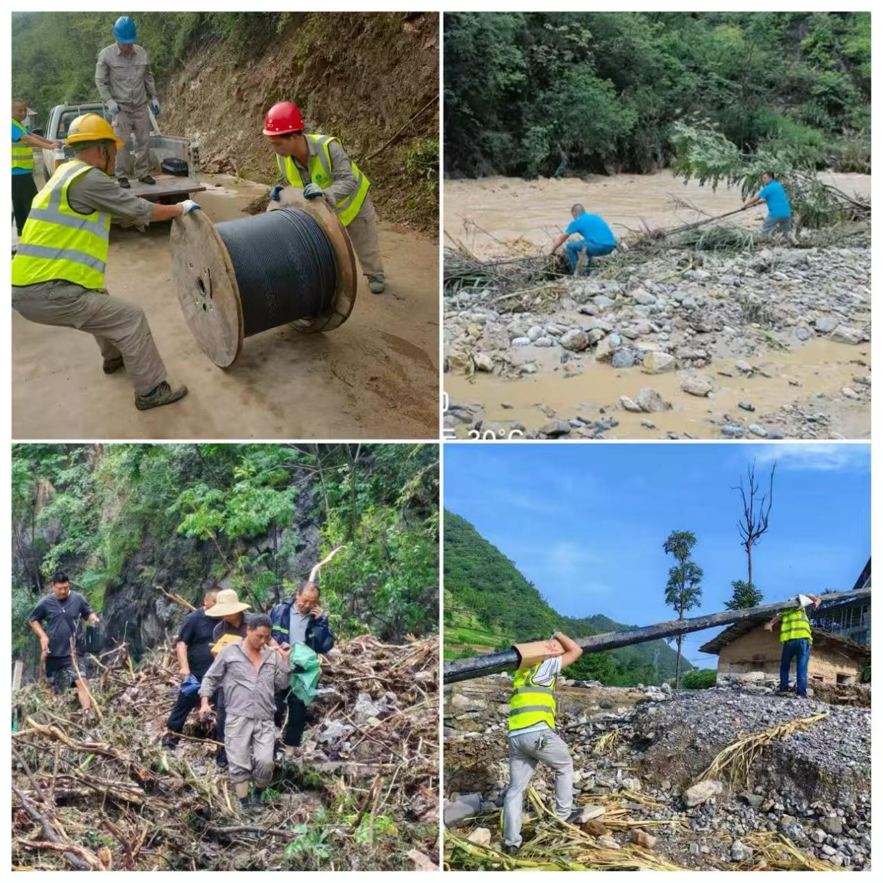 香口湖岭村是此次受灾最为严重、线路规划难度最大的区域之一。线杆路全部分布在跨河的山上,暴雨过后,道路被淹没,泥石流堆积如山,河水汹涌澎湃,车辆无法通行,徒步也充满危险。如何将1600米24芯光纤安全运送到对岸,成为摆在大家面前的首要难题。